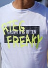 R.T.E.G Graffti TEE 夏に映えるネオンカラーと袖元のパイナップルがアクセントのTシャツが登場! フロントに描かれたグラフィティーロゴがポップなデザインの1枚。 デニムとの相性抜群でこのシーズンに映えるアイテムです。 ※お届けから7日以内までは、サイズの変更が可能です。