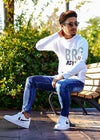 1086Mall Knit adamsJUGGLERのニット ソフトタッチのニット素材。 ランダムに配列された文字でデザイン構成。 一枚着でもインパクトがあり、アウターシーズンに羽織物を脱いだシーンでも オシャレに決まるニット!! ※お届けから7日以内までは、サイズの変更が可能です。