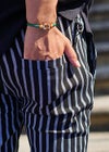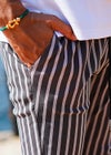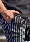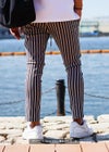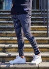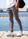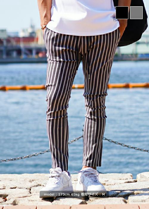 スッキリとした印象を与えるストライプパンツはイケてる男のマストアイテム。