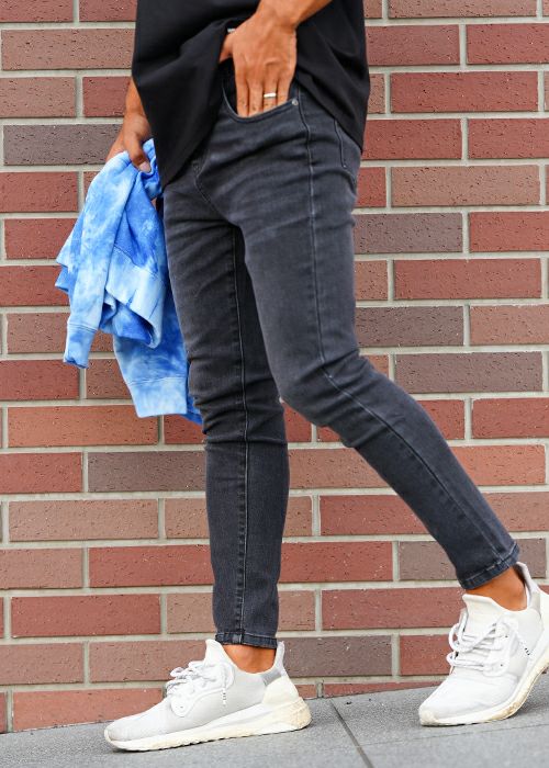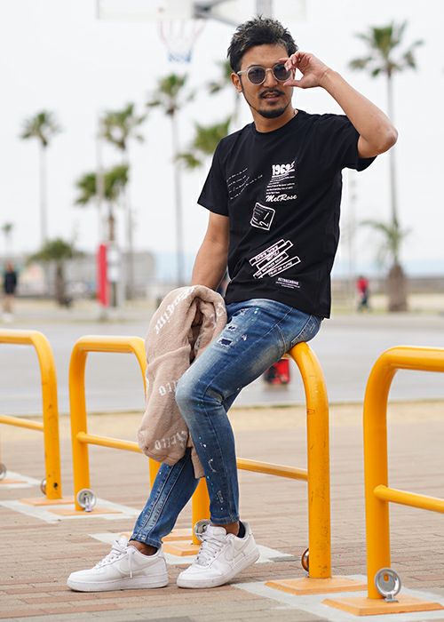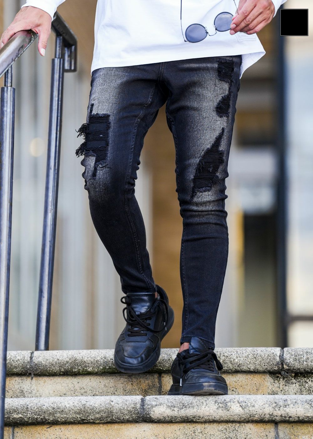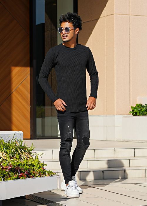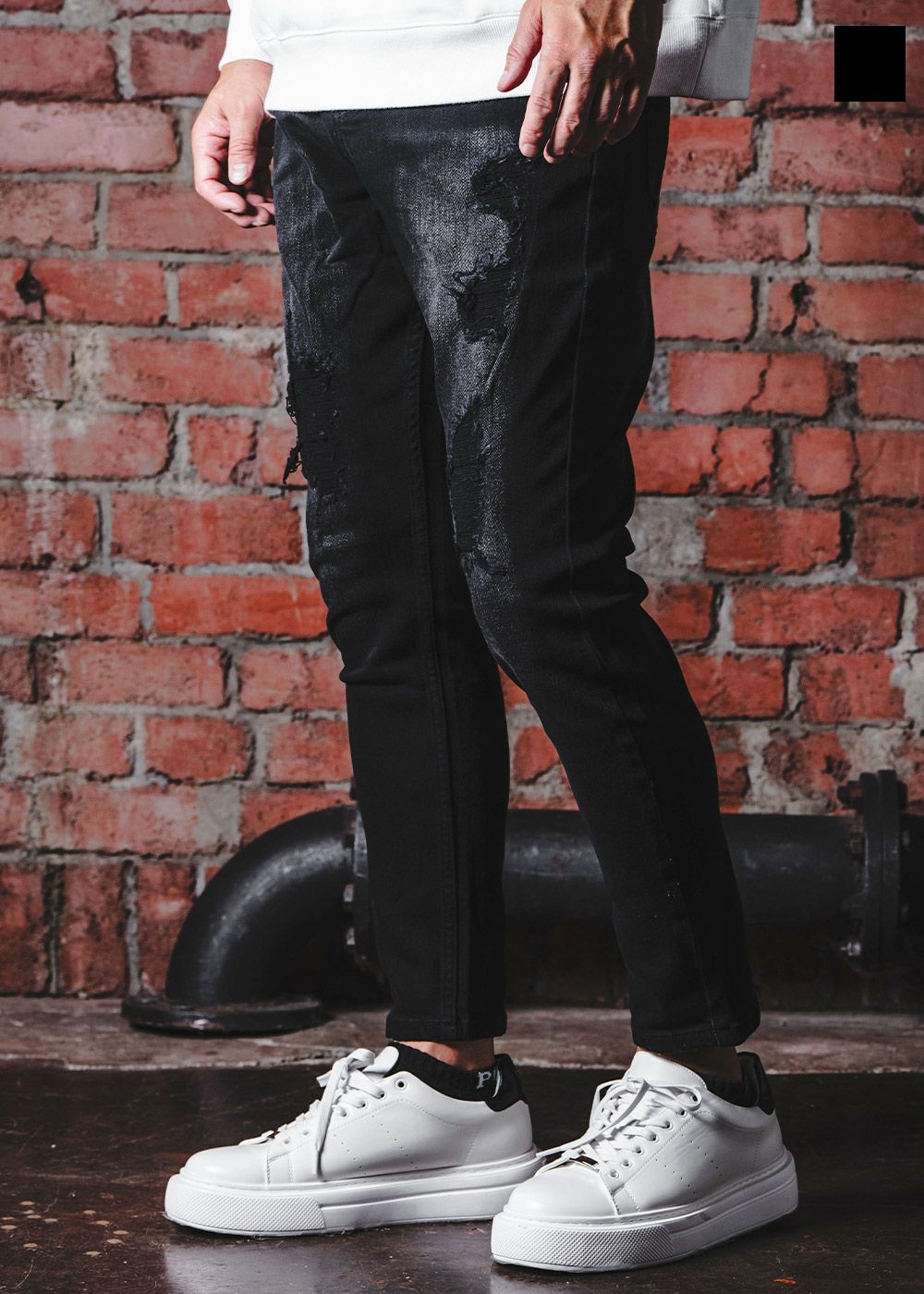 バーティカルダメージブラックデニムロングパンツ