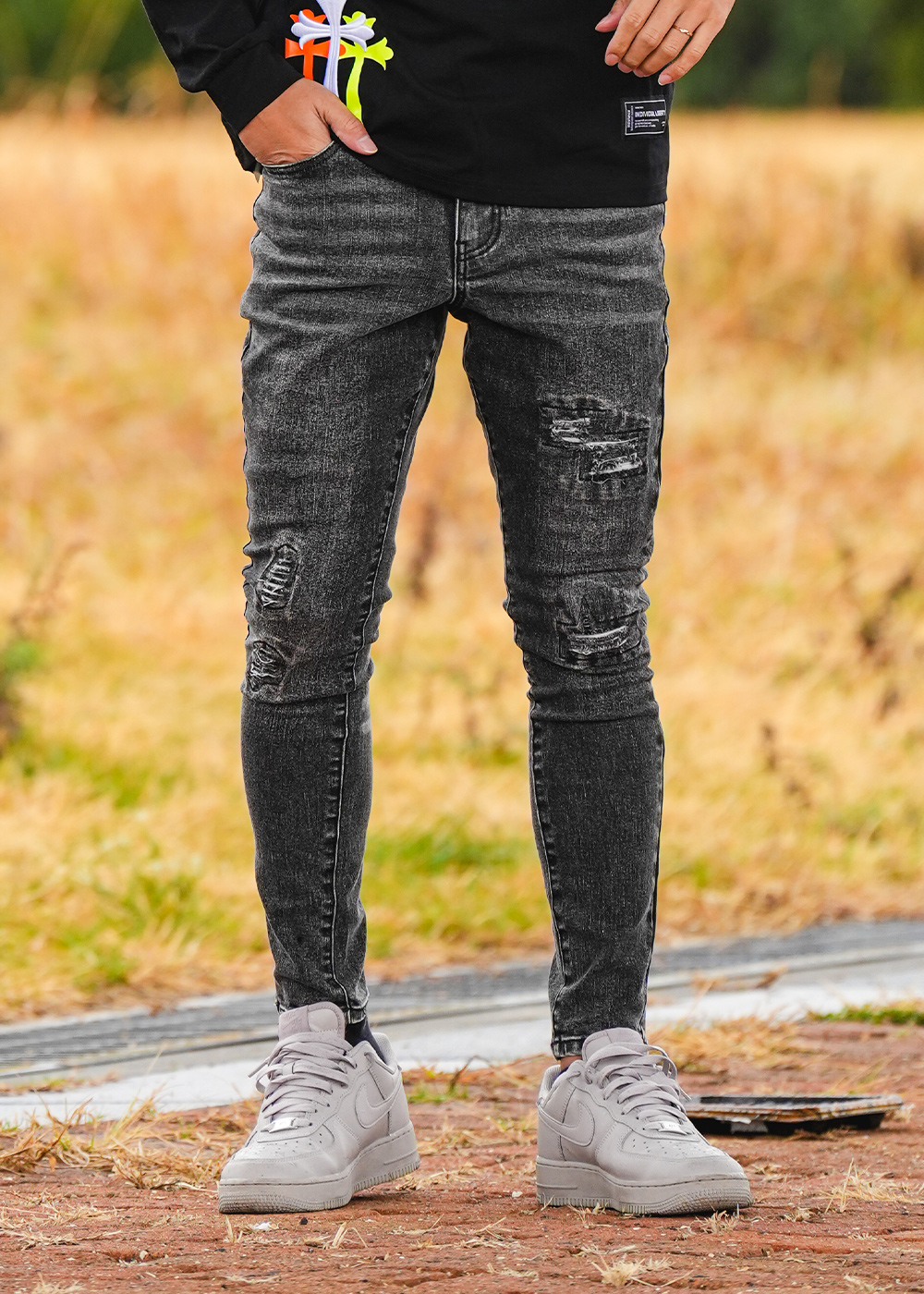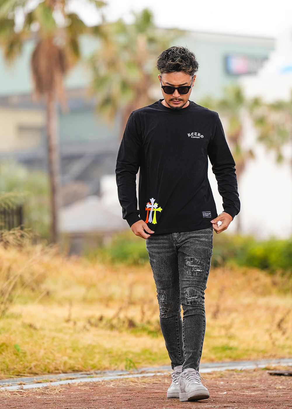 ロンTの「RTEG T.C Cross L/TEE」は、胸元にオールドイングリッシュのプリントを添え、背中にはクロスの刺繍とネオンカラーのプリントでエッジを効かせた、視線を引き寄せる一枚。