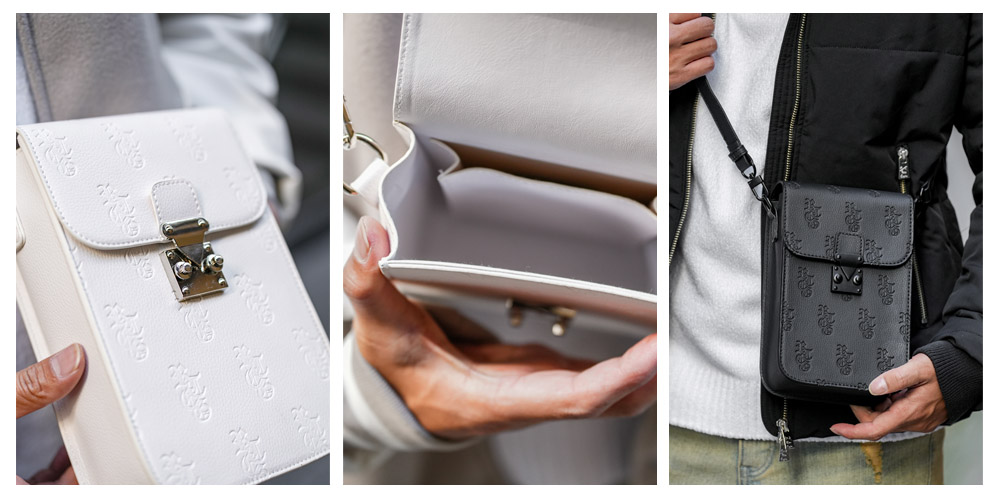 高級感のある型押しレザーと金具使い。