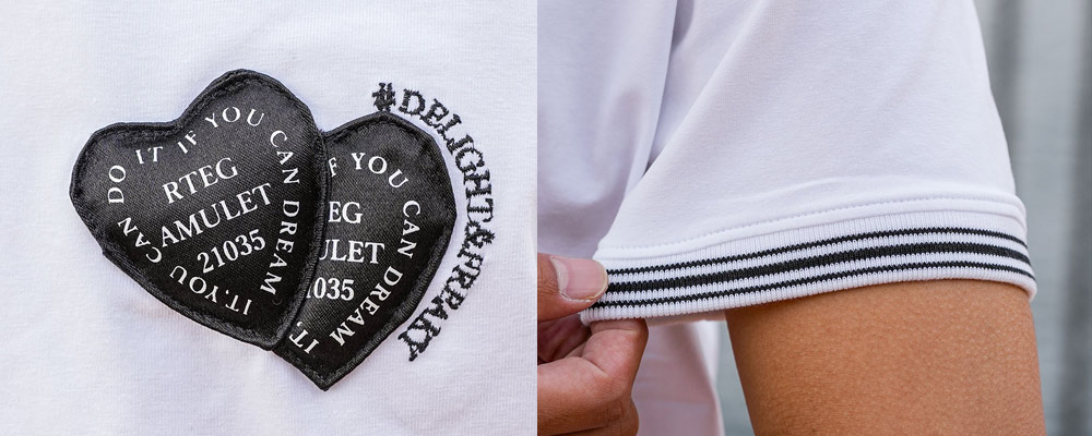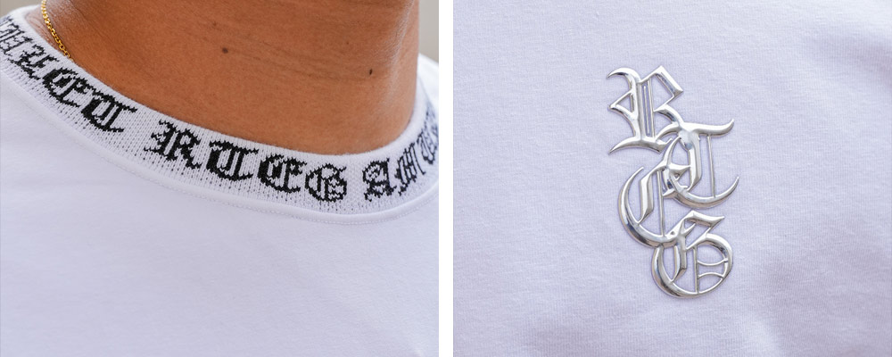 最大の見どころは、ネックライン。ぐるりと配されたオールドイングリッシュのロゴが、ネックレスをつけなくても顔まわりを華やかに、そしてクールに引き締めてくれます。さらに胸元には、立体的な高周波のアクセントをプラス。